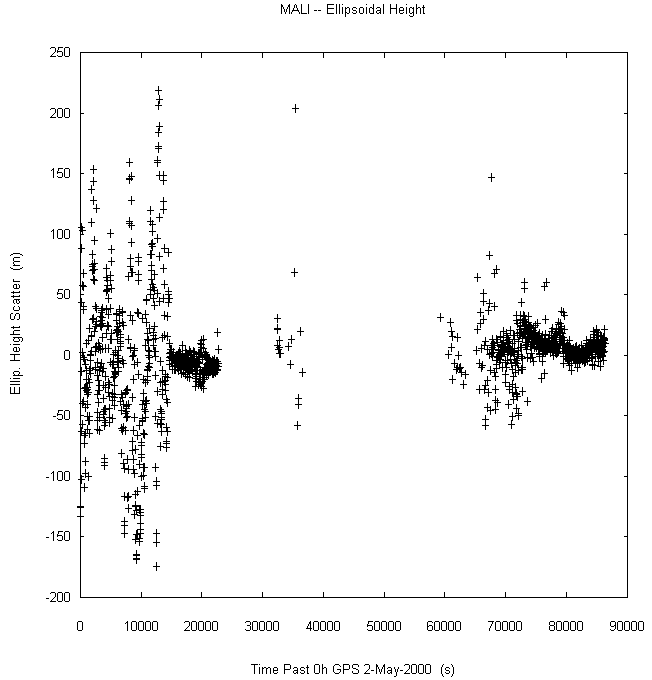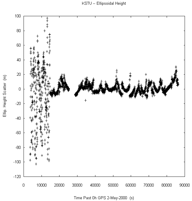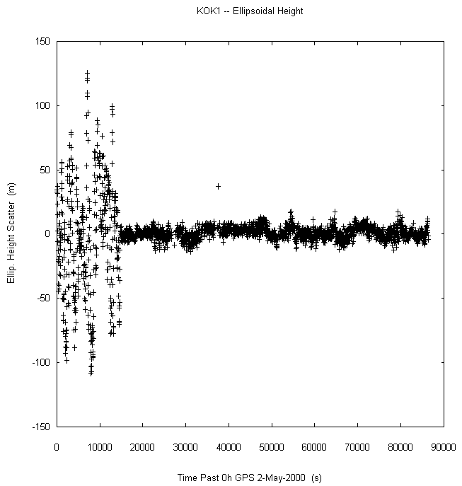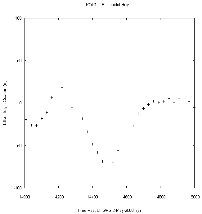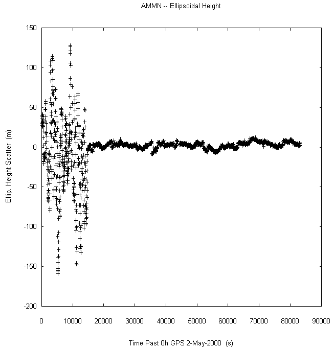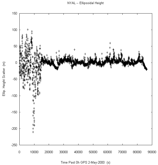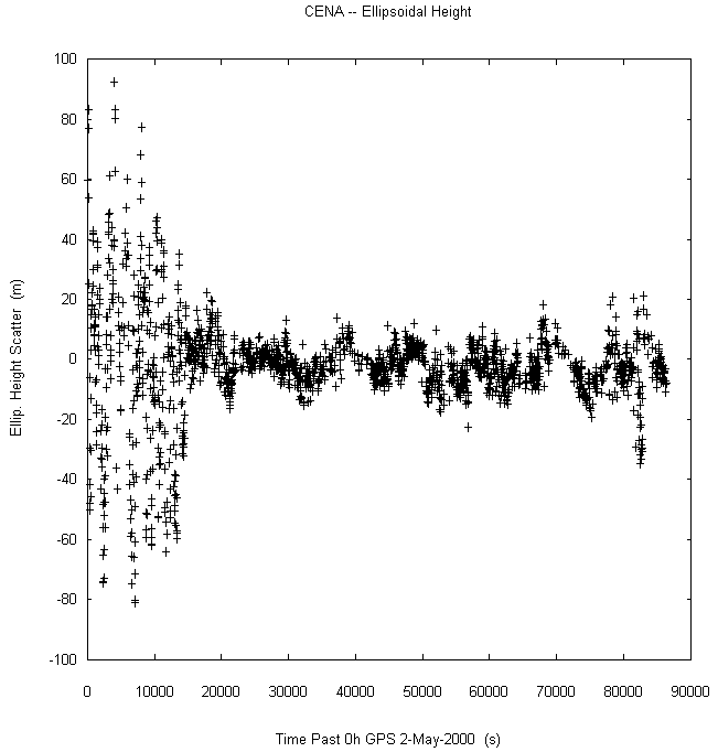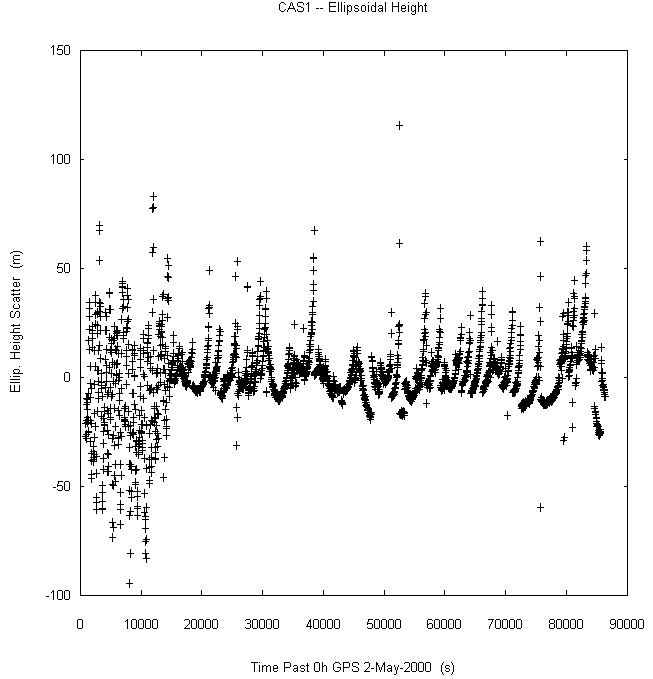 Data taken at numerous sites from 0000 to 2359 UTC on May 2, 2000. GPS data were dual-frequency pseudorange (both L1 and L2) incorporating ionospheric correction. Data were processed in accordance with the GPS Interface Control Document ICD-GPS-200C, using the broadcast orbit parameters in the World Geodetic System WGS 84 (G873) reference system. Tropospheric corrections have not been applied.
