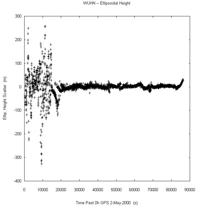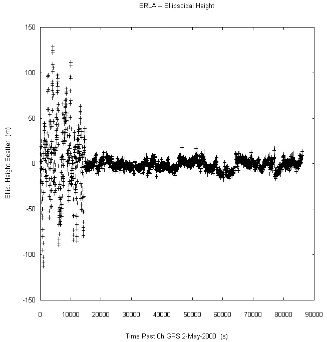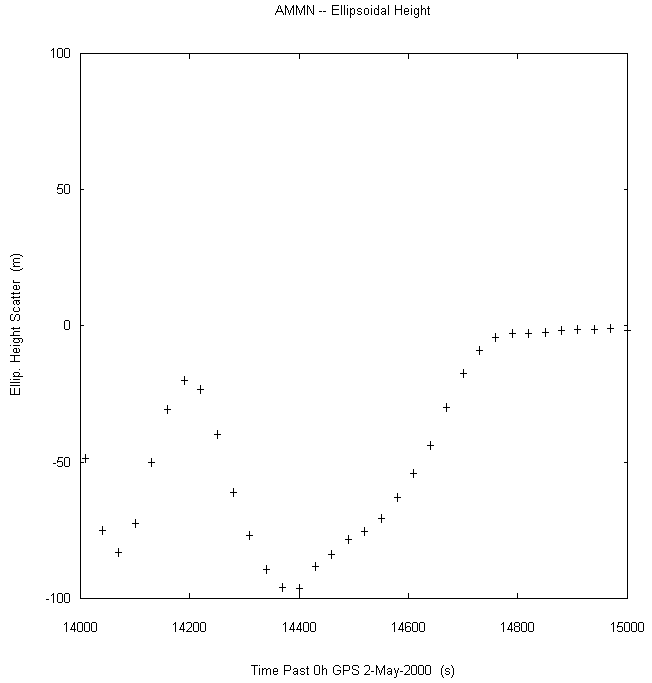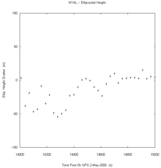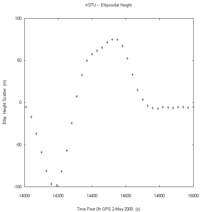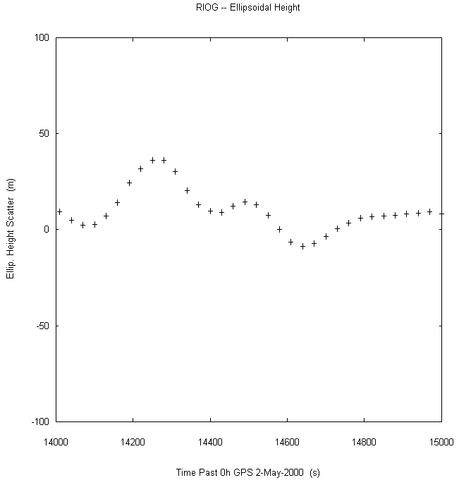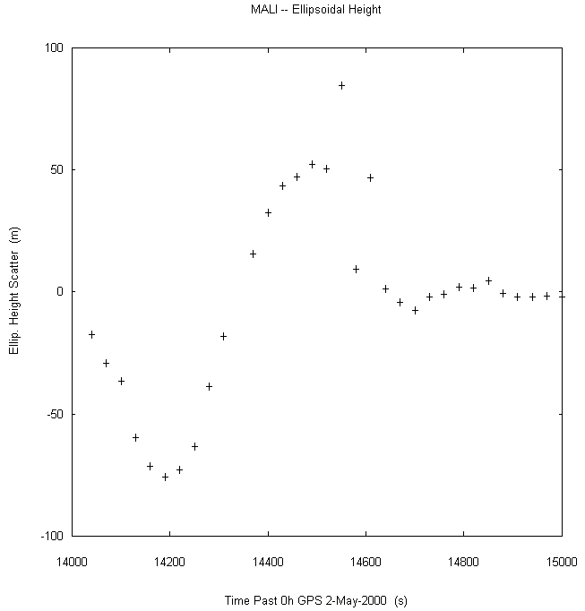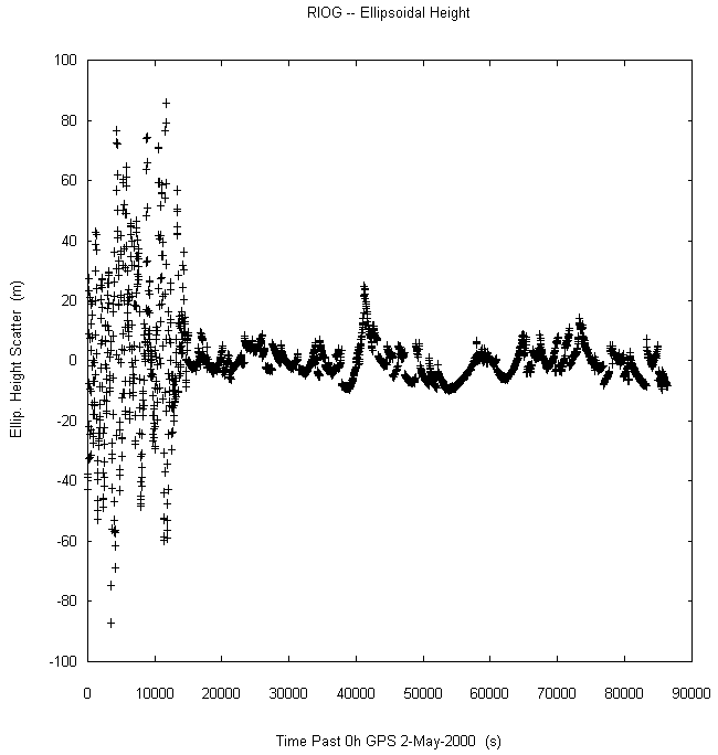 Data taken at numerous sites from 0000 to 2359 UTC on May 2, 2000. GPS data were dual-frequency pseudorange (both L1 and L2) incorporating ionospheric correction. Data were processed in accordance with the GPS Interface Control Document ICD-GPS-200C, using the broadcast orbit parameters in the World Geodetic System WGS 84 (G873) reference system. Tropospheric corrections have not been applied.