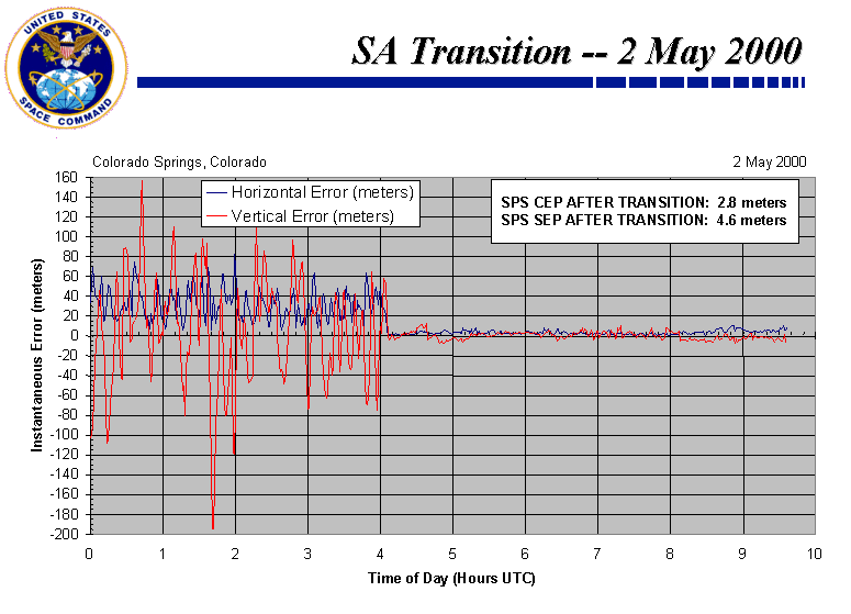 This is a plot of GPS navigational errors through the SA transition prepared by Rob Conley of Overlook Systems for the GPS Support Center in Colorado Springs, Colorado. The GPS errors can be seen diminishing significantly around 0405 UTC (shortly after midnight EDT). The data indicates a circular error of only 2.8 meters and a spherical error of 4.6 meters during the first few hours of SA-free operation. The data was measured using a Trimble SV6 receiver.